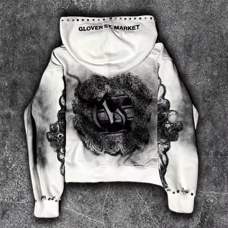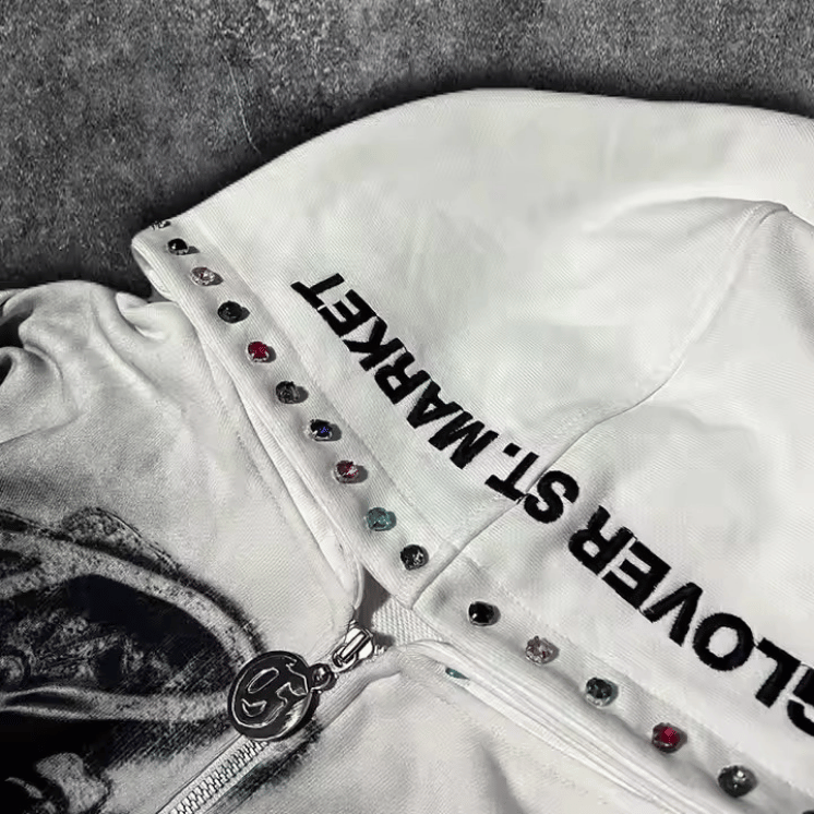 Dirty Washed Zipper Rhinestone Hoodie Men Graphic Printed Logo French Terry Streetwear Vintage Distressed Hoodie