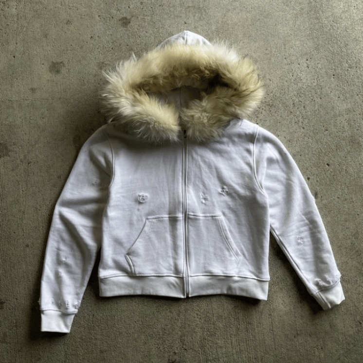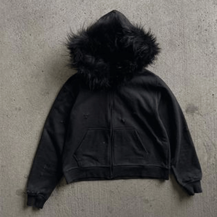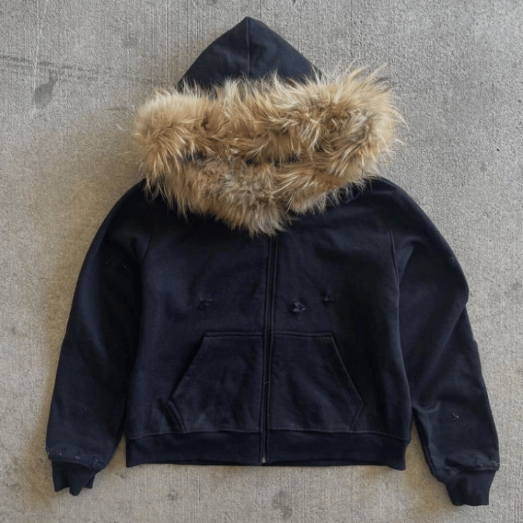 French Terry Hoodie With Fur Hood Vintage Organic Cotton Zip Up Faux Fur Hoodie